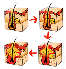 그러나 이때 모낭 입구의 모낭 상피세포가 비정상적인 각화를 일으켜 입구를 막게 되면 피지가 통로에 차게 되고, 이 곳에 박테리아가 증식하여 염증성 병변을 형성하게 됩니다.