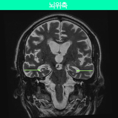 3)뇌위축(MRI)알츠하이머병의 뇌자기공명 영상 위축은 주로 측두엽 해마 부위의 위축을 의미합니다. 이는 나이에 따른 해마 위축을 고려해야 하므로 의심 정도는 가능하지만 단정적으로 진단할 수 없습니다. 정상 노인은 위축 변화가 완만하게 진행되고 개인별로 차이가 크기 때문입니다. 그러나 비교적 조기에 변화를 발견할 수 있고 치매를 일으키는 다른 질환인 뇌종양, 뇌경색, 뇌출혈, 뇌염 등의 진단에 우수하므로 꼭 필요한 검사입니다. 기타 다른 질환, 즉 인접 부위 뇌경색이나 경련성 질환에서도 위축이 있으므로 모든 해마 위축이 알츠하이머병을 의미하지는 않습니다.