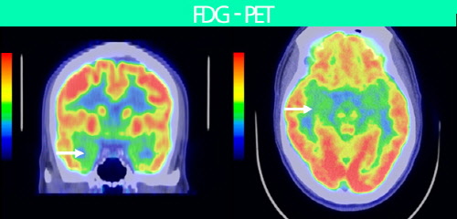 FDG에서 G는 포도당(Glucose)을 의미하는 영어 약자로 FDG-PET은 뇌의 포도당 사용 분포를 보여 주는 검사입니다. 세포가 손상되어 기능이 약화되기 시작하면 이 검사에서 변화가 일어나므로 조기에 진단이 가능합니다. 또한, 영상을 통해 인지기능 저하 영역을 영상으로 직접 볼 수 있어 진단에 많이 이용됩니다. 그러나 높은 비용과 검사 시 동위원소 반감기를 정확히 지켜야 한다는 번거로움이 있습니다.
