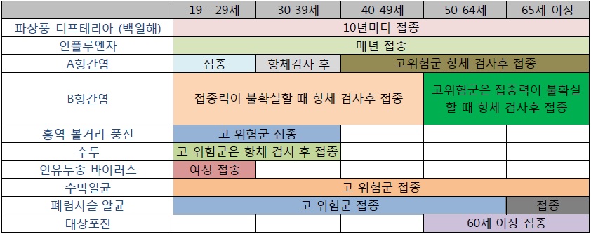 20-30대의 젊은 성인이라면, A형, B형 간염, 파상풍 백신이 권고되며, 50-60세 이상의 장년층에서는 폐렴 백신, 대상포진 백신을 권하고 있다. 임신부 역시 백신 접종이 필요한데, 파상풍, 백일해 결합 백신과, 독감 백신은 임신을 준비 중이거나, 임신 중이라면 반드시 접종할 것을 권한다. 파상풍-백일해 백신의 경우 접종력이 없는 여성은 출산직후, 임신전에 1회 접종하면 되고, 임신중이더라도 27~36주의 경우 접종가능하다. 60대 이상이 되면 대상포진의 위험성이 커지므로 예방접종을 권한다.
