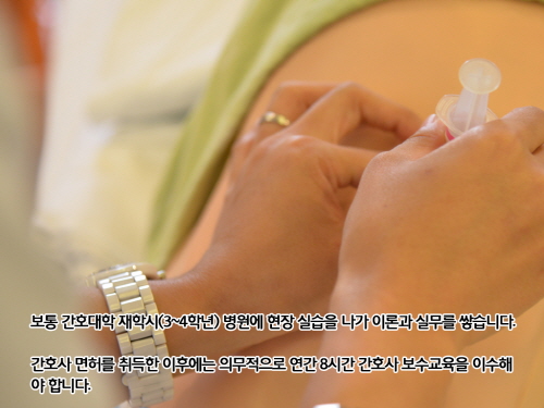 보통 간호대학 재학시(2~4학년) 병원에 현장 실습을 나가 이론과 실무를 쌓습니다.