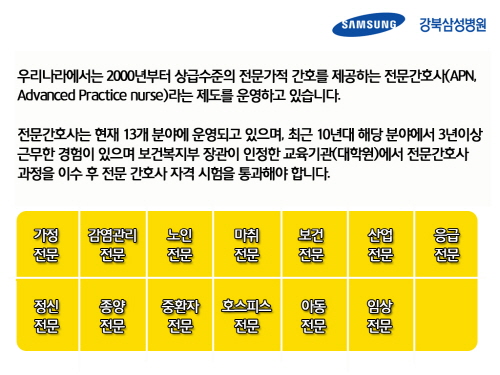 우리나라에서는 2000년부터 상급수준의 전문가적 간호를 제공하는 전문간호사(APN, Advanced Practice nurse)라는 제도를 운영하고 있습니다.