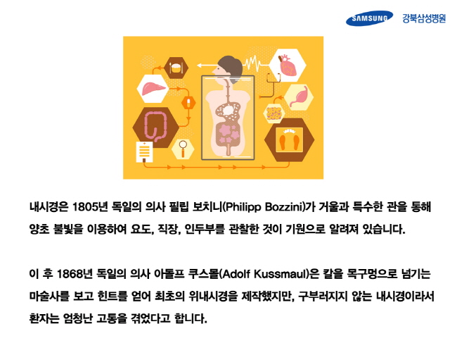 이 후 1868년 독일의 의사 아돌프 쿠스몰(Adolf Kussmaul)은 칼을 목구멍으로 넘기는 마술사를 보고 힌트를 얻어 최초의 위내시경을 제작했지만, 구부러지지 않는 내시경이라서 환자는 엄청난 고통을 겪었다고 합니다.