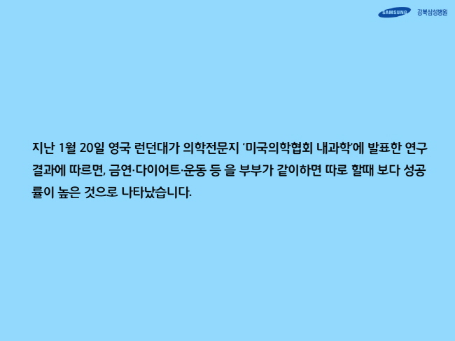 지난 1월 20일 영국 런던대가 의학전문지 ‘미국의학협회 내과학’에 발표한 연구결과에 따르면, 금연·다이어트·운동 등 을 부부가 같이하면 따로 할때 보다 성공률이 높은 것으로 나타났습니다.