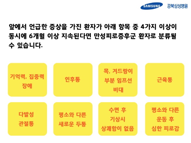 앞에서 언급한 증상을 가진 환자가 아래 항목 중 4가지 이상이 동시에 6개월 이상 지속된다면 만성피로증후군 환자로 분류될 수 있습니다.