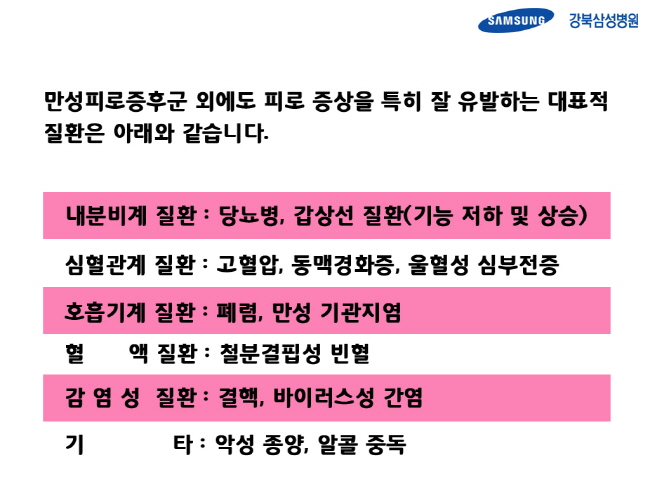만성피로증후군 외에도 피로 증상을 특히 잘 유발하는 대표적 질환은 아래와 같습니다.
