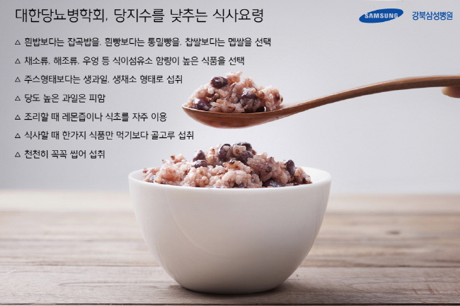 대한당뇨병학회에서도 당지수를 낮추는 식사요령을 다음과 같이 소개하고 있습니다.