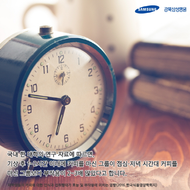 기상 후 1~2시간 이내에 커피를 마신 그룹이 점심·저녁 시간대 커피를 마신 그룹보다 부작용이 2~3배 많았다고 합니다.