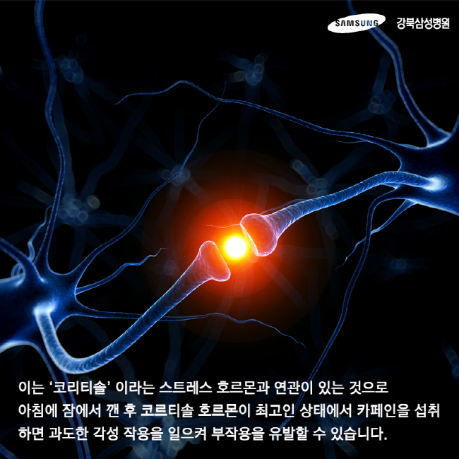아침에 잠에서 깬 후 코르티솔 호르몬이 최고인 상태에서 카페인을 섭취하면 과도한 각성 작용을 일으켜 부작용을 유발할 수 있습니다.