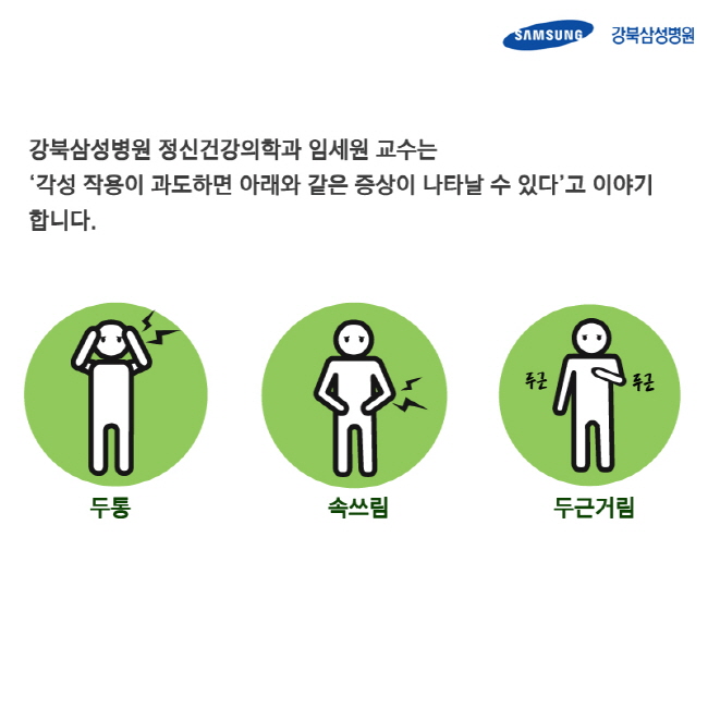 강북삼성병원 정신건강의학과 임세원 교수는 '각성 작용이 과도하면 두통, 속쓰림, 두근거림 등의 증상이 나타날 수 있다고 이야기 합니다.