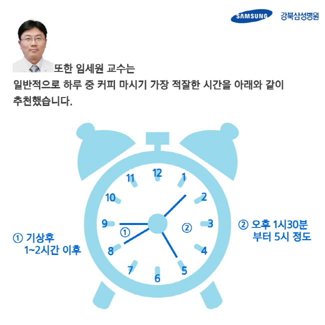 또한 임세원 교수는 일반적으로 하루 중 커피 마시기 가장 절절한 시간을 기상후 1~2시간 이후, 오후 1시30분부터 5시 정도로 추천했습니다.